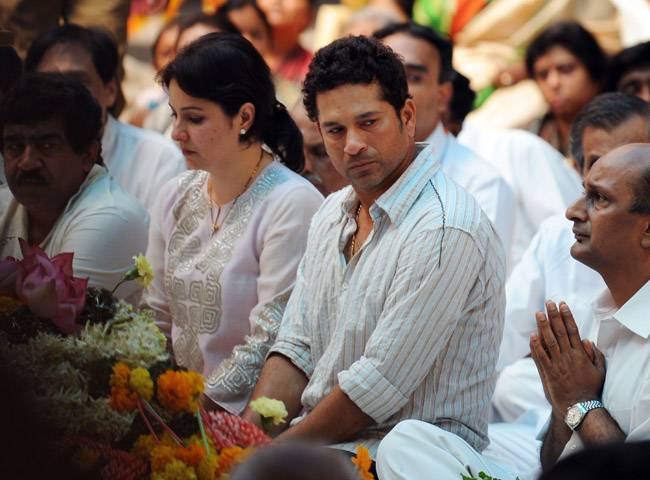 Master blaster Sachin Tendulkar broke down while paying his last respects to spiritual leader Sathya Sai Baba here Monday. Accompanied by wife Anjali and friend V. Chamundeshwarnath, Sachin sat beside the body of Sathya Sai Baba at Sai Kulwant Hall in Prashanti Nilayam, and prayed for him. Sachin, an ardent devotee of Baba, was seen wiping his tears from a handkerchief handed over by his wife.
